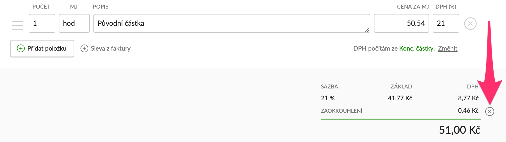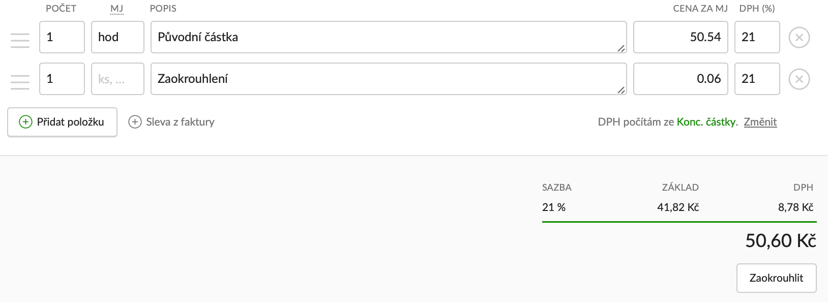 Na faktuře máte možnost zaokrouhlit celkovou částku, což může ovlivnit také základ a výši DPH v závislosti na nastavení výpočtu DPH (ze základu či koncové částky).