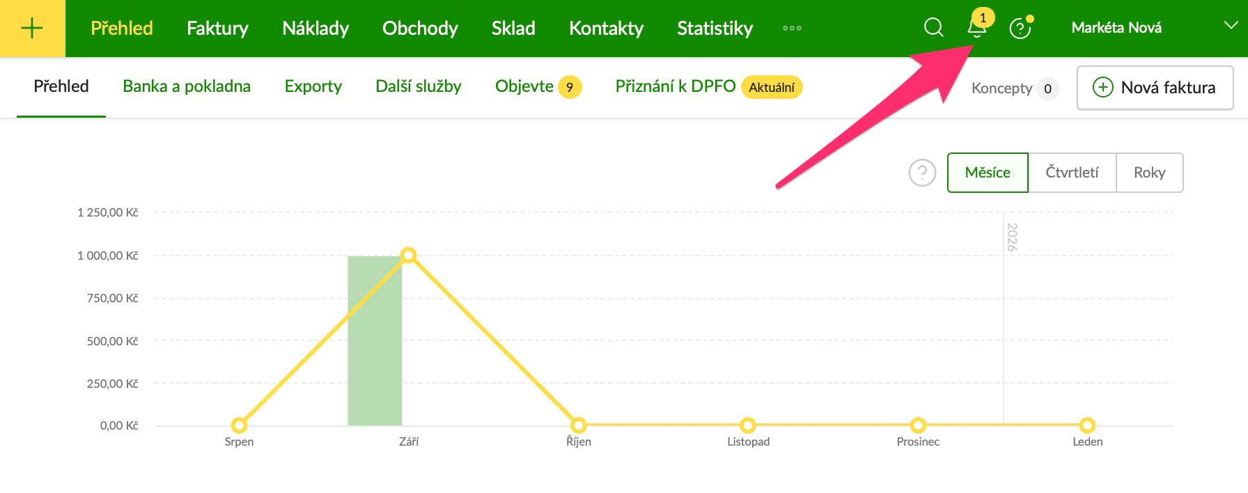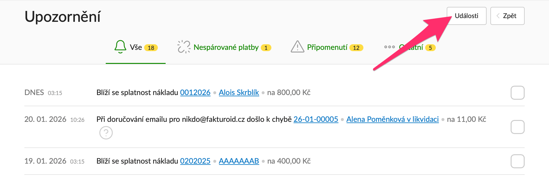 Po přihlášení do Fakturoidu najdete vpravo nahoře Zvoneček. Pokud se stane něco, co je v účtu potřeba vyřešit, svítí tu i číslo s počtem událostí. Upozornění si také můžete nechat zasílat každý den přímo do e-mailu.