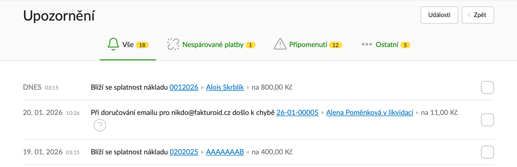 - Emaily - když se třeba nepodaří doručit email s fakturou.