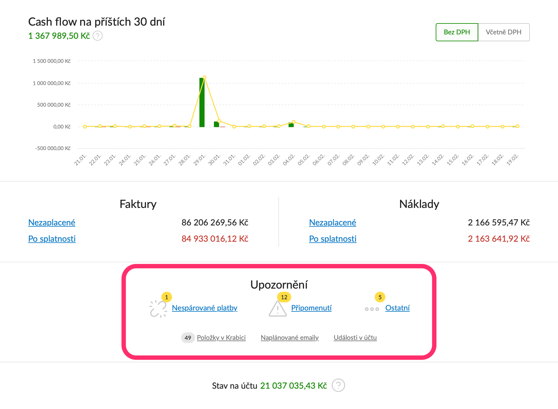 - Připomenutí - najdete tu upozornění na splatnost nákladu, faktury po splatnosti, vyčerpané zásoby na skladě nebo další kroky obchodních případů.