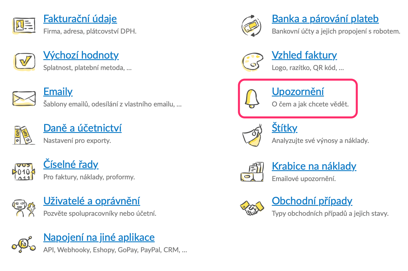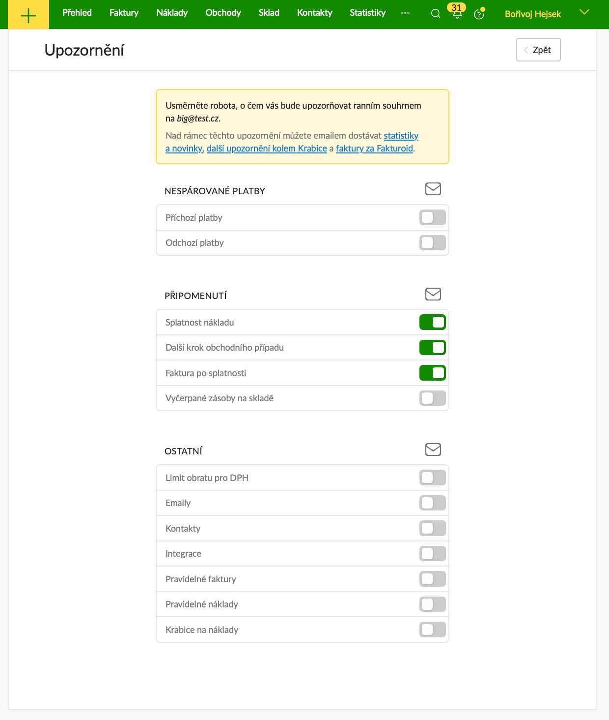 - Ostatní - sem spadají všechna zbylá upozornění jako třeba přiblížení limitu obratu pro plátcovství DPH, problémy s doručením e-mailu s fakturou atp.