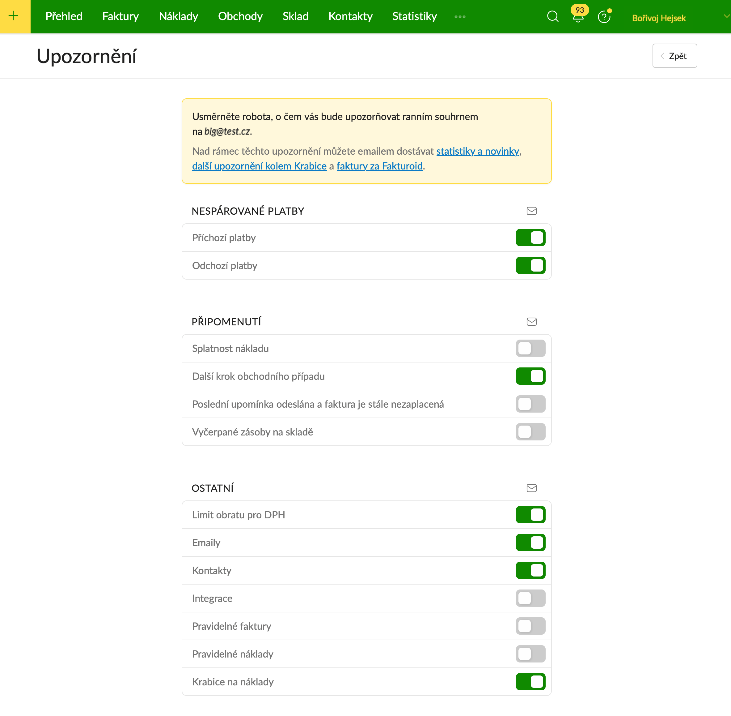 Aby vám nic důležitého neuniklo, najdete ve Fakturoidu vpravo nahoře zvoneček s upozorněními. Shromažďuje vše, co potřebuje vaši pozornost — od nespárovaných plateb po faktury po splatnosti. Pokud chcete přehled i do e-mailu, stačí si zapnout denní souhrn.