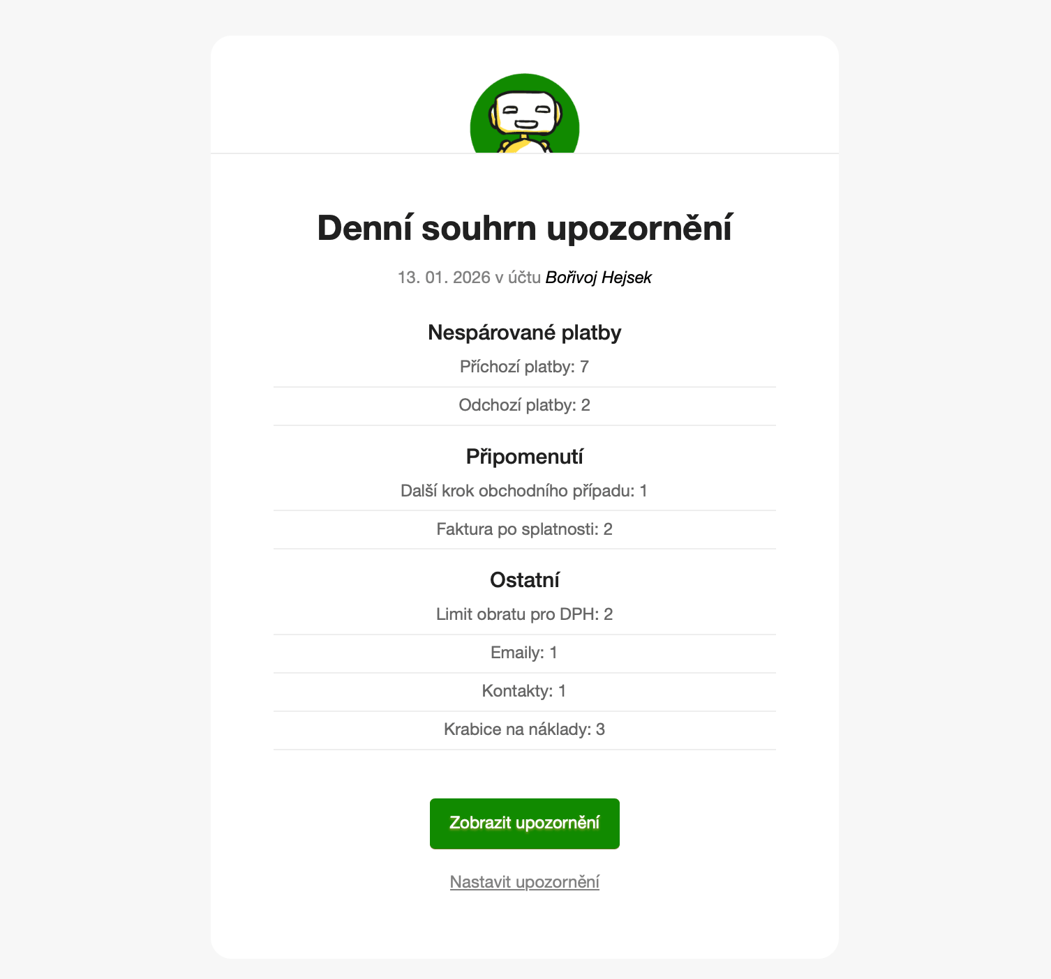 Pojďme si rozebrat jednotlivé sekce nastavení, které vychází z rozdělení ve Zvonečku. Nespárované platby - všechny příchozí a odchozí platby, které se robotovi nepodařilo spárovat. V Připomenutí pak najdete upozornění na splatnost nákladu, dalšího kroku obchodních případů, upozornění na fakturu po splatnosti a vyčerpané zásoby na skladě.