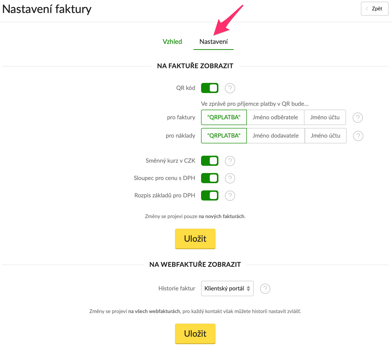V Nastavení → Vzhled faktury si nahoře překliknete na Nastavení a tady můžete dále nastavit zobrazování: