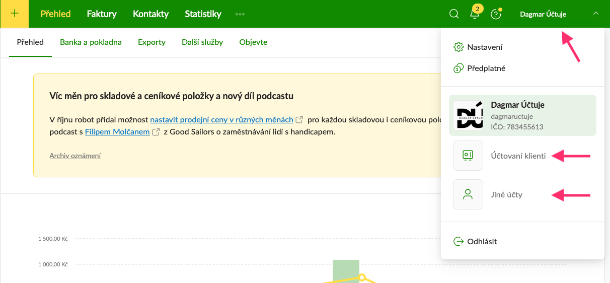 Stačí se přepnout do sekce Účtovaní klienti kliknutím na Název účtu a v rozbaleném menu potom na Účtovaní klienti. Zde uvidíte klientské účty - majitel všechny a zaměstnanci jen ty, ke kterým jsou přiřazeni, a odkazy na jednotlivé exporty. Můžete zde i jednoduše vyhledávat.