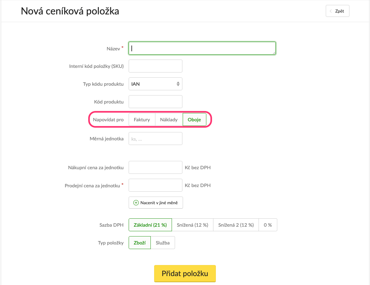 Jakmile položku přidáte do Skladu, napovídání na fakturách se aktivuje automaticky. Ve formuláři položky vyplňte předpřipravená pole a zvolte, zda vám bude robot položky napovídat: