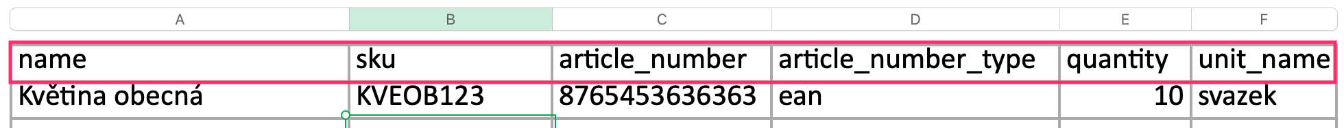 Robot vytvoří soubor ve formátu Excel (.xlsx), který obsahuje sloupce name, sku, article_ number, article_ number_ type, quantity a unit_ name.