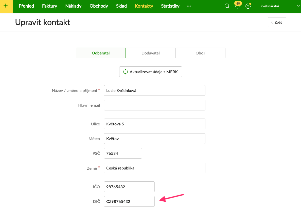 Jak zadáte DIČ u vašich kontaktů?